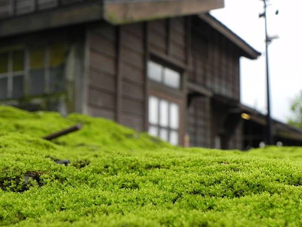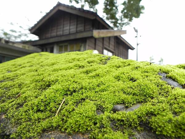 透過翠綠青苔看著古早的木建築,感覺還不錯。