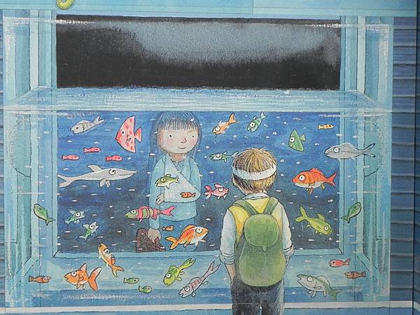 繪本「星空」裡的小男孩與小女孩一起等公車上下學場景,這一對學生情侶是號稱台灣等公車等最久的,因為到現在還沒座車啦。