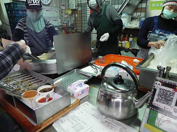 環境還OK,店員也都有戴口罩工作,做好的蔥油餅會放到旁邊架上讓客人自行塗醬。