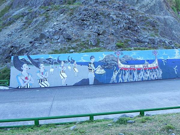 來到蘭嶼有不少的景色或是特色是必看的,例如~~拼板舟,地下屋,丁字褲,甩髮舞....,真人甩髮舞可能要節慶才有機會,不小心看到路上這壁畫有,就拍拍了。