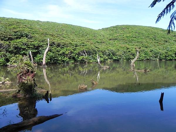 走到一片平坦的樹林後就快到了大天池了,有一些像是南投的忘憂森林,但是這裡有著更美的藍天。