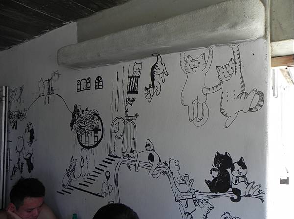 牆上有不少貓的繪圖。