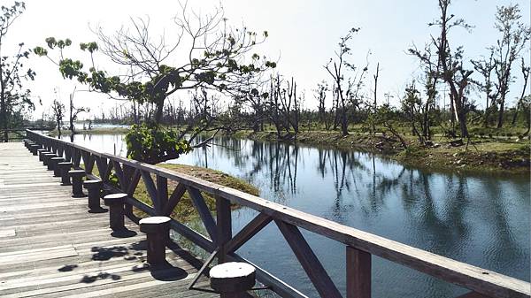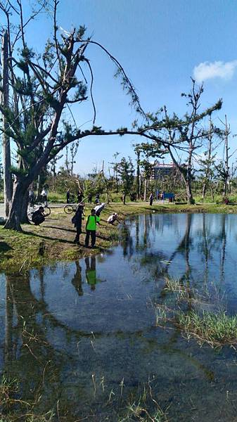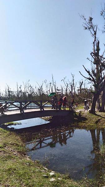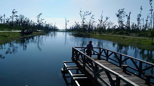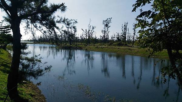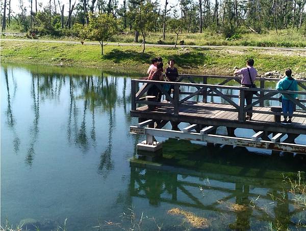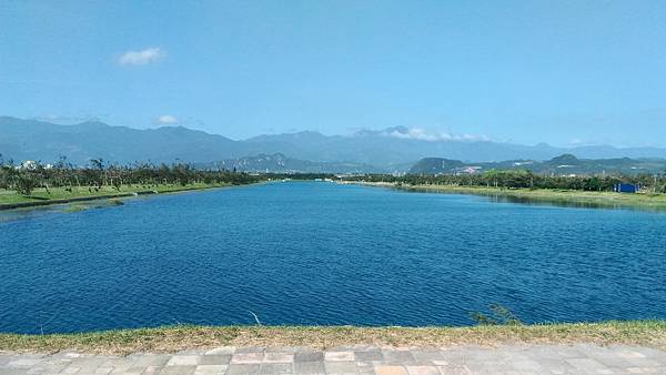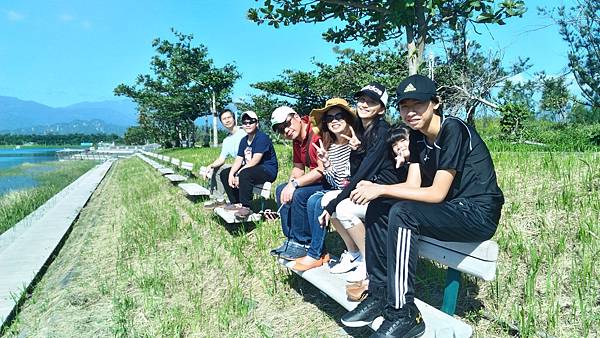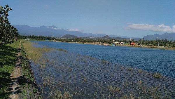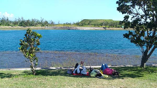 繼續前進繞到<活水湖>,遠看這邊的湖水蔚藍,原來其形成原因是由卑南溪地下湧泉不斷冒出,加上出海口已經被沙嘴阻擋於是形成現在的湖泊,可以沿著湖畔繞行一圈,也有民眾攜老扶幼在樹蔭下乘涼歇息,好一幅悠閒景致。