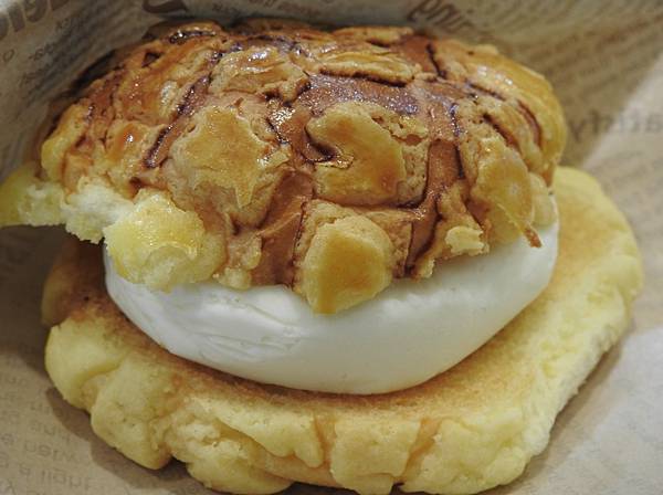 我比較喜歡另一個稱呼~冰火波蘿包,這好像是香港的說法,主要是一個熱呼呼的菠蘿麵包中間夾著一塊冰冰的冰淇淋,一口咬下2種感覺,好吃。