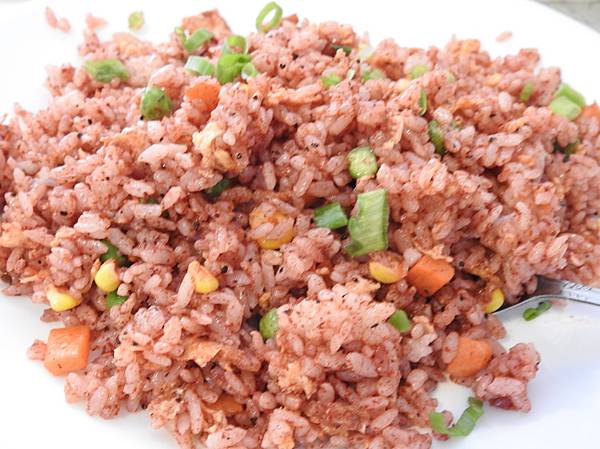 紅糟炒飯其實跟一般的炒飯差不多,配料是玉米、紅蘿蔔、碎花青蔥⋯⋯(恩....好像沒有肉耶),但是加上紅糟拌炒後成為一道喜人的料理,重點是吃起來也不錯,可以吃吃看。
