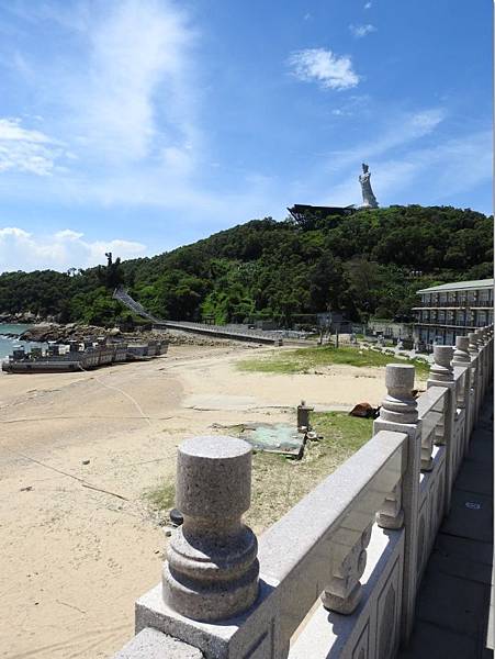 右側的海灘停放一些艦艇,上方是大名鼎鼎的媽祖巨神像。