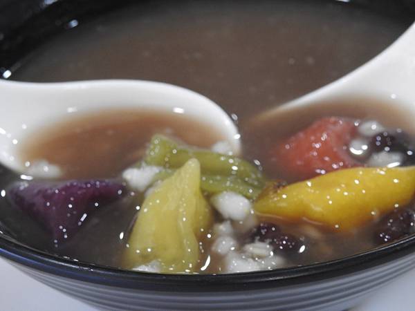我們點去冰的,不愧是五行黃金地瓜餃,顏色很繽紛,QQ的地瓜餃裡面包著碎花生加糖粉及芝麻,甜阿。