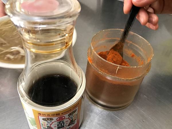 五印醋沒吃過,不過南部的一些羹湯店好像非常喜歡用,紅色的是辣椒粉,我覺得原味就很好吃了,看個人喜好了。
