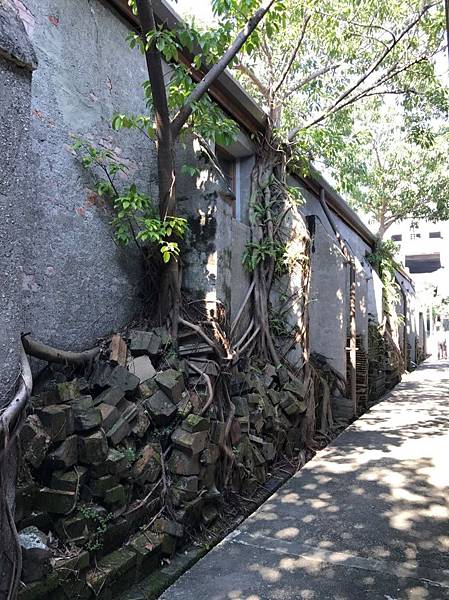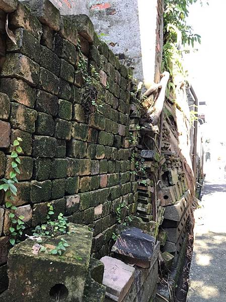 舊建築拆下的紅磚堆疊在通道兩側,不管是整齊排列或是隨意放置,在歲月的痕跡下都布滿了青苔,給人時光匆匆的錯覺,漫步在此彷彿回到了過去,一步一繁榮,通道走完也像是經歷的過去的繁榮。