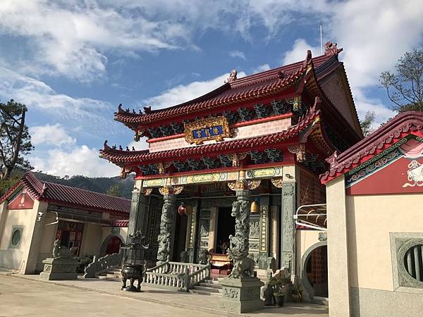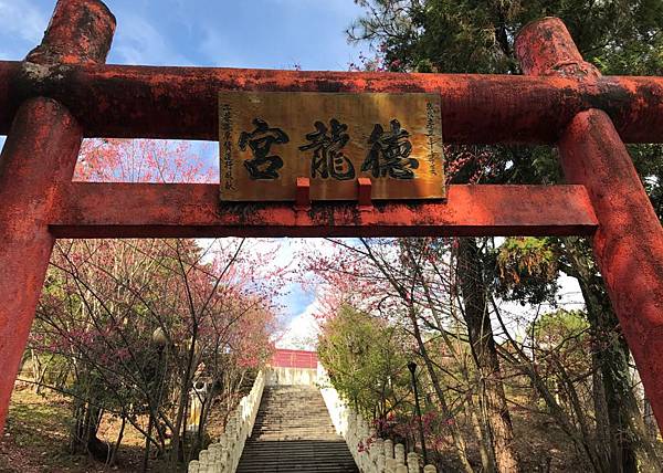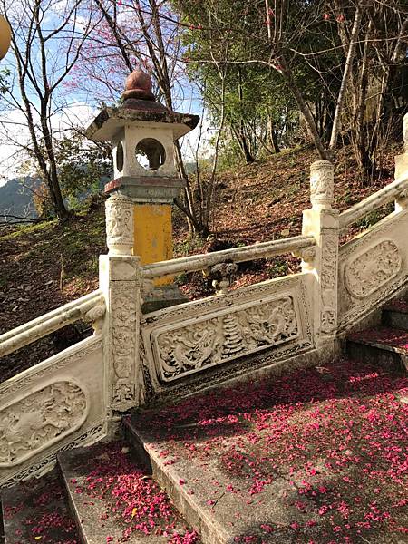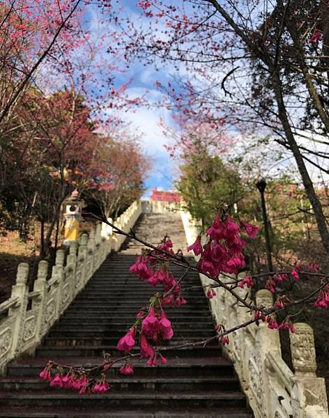 今天目標是青青草原的天空步道,朋友說往清境的路上有一個地方可以稍作休息順便賞櫻花,當然要看看了,第一次來到德龍宮,不知道有停車場,所以直接開到階梯入口旁停放(其實停車場要沿著右邊叉路上去)。