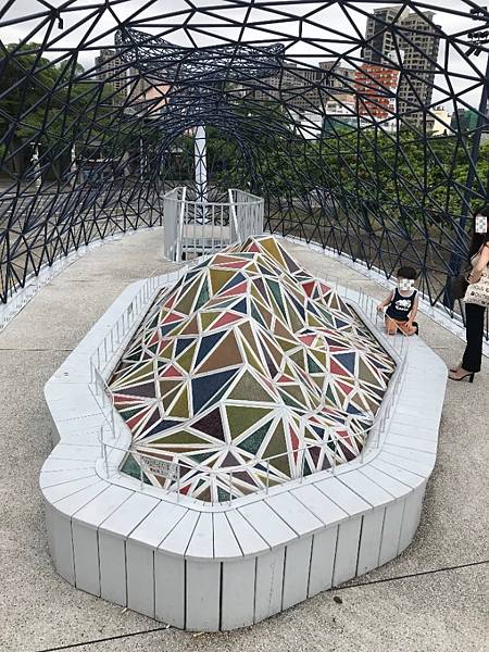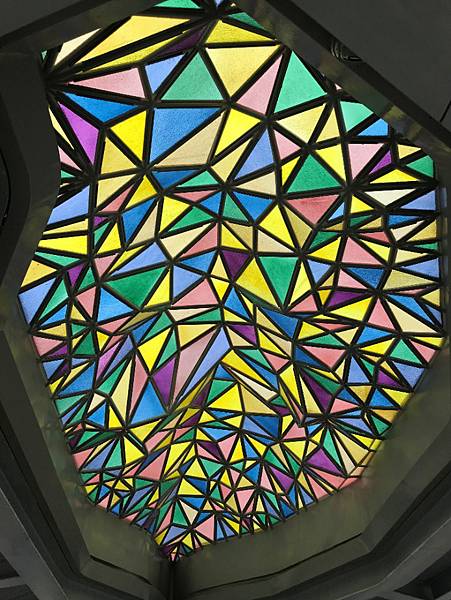 從下方看內部象徵大鯨魚心臟的台灣圖形,則以634支不鏽鋼管焊接構成,並在其間鑲嵌448片釉燒玻璃,多彩的台灣象徵因包容而豐富多采的島嶼。