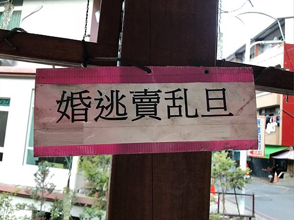 涼亭柱子上有一個有趣的告示 < 婚逃賣亂旦 > ,用台語念就知道意思了。