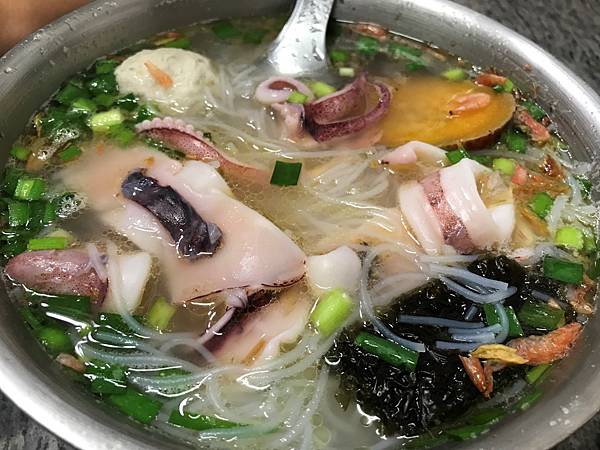 小卷雞湯米粉配料很豐富,可以看到一碗裡頭滿滿的料,除了地瓜片、虱目魚丸外,還加了一些蝦米、海苔提味,真的是營養豐富,可以吃得飽飽。