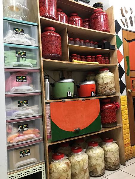 雖然已經是晚上快8點了,但是店裡幾乎客滿,老闆娘很親切地解釋,我們旁邊這一櫃子滿滿的都是自製水果泡菜跟泡辣椒。