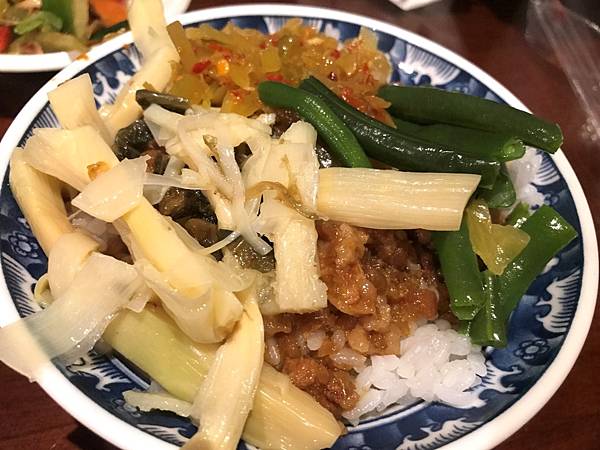 店內幾乎是高朋滿座,但是出菜的速度真的非常的快,我們只點了幾樣小菜和讓很多饕客們特地遠道而來品嘗的魯肉飯,就是這樣一碗平價的魯肉飯,可以看到上頭竟然放著5種配菜,感覺就像是一個便當一樣的豐富,每種菜都不錯,最重要的飯和魯肉拌在一起,滷汁充分地與白飯結合,感覺配菜是多餘的,可以直接賣魯肉飯了。