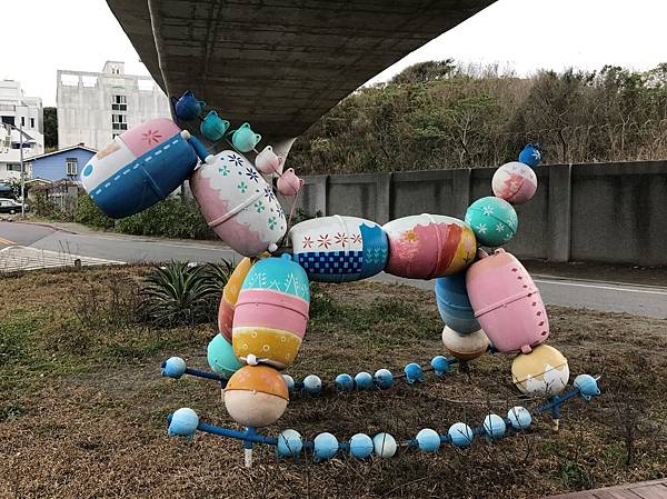 對面橋下的停車場有一個浮球的裝置藝術-大型搖搖馬。