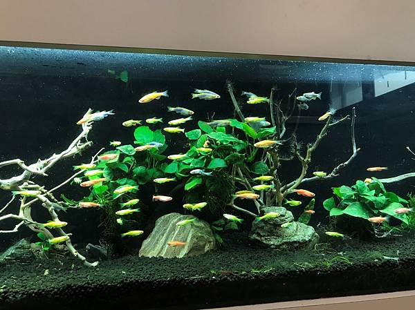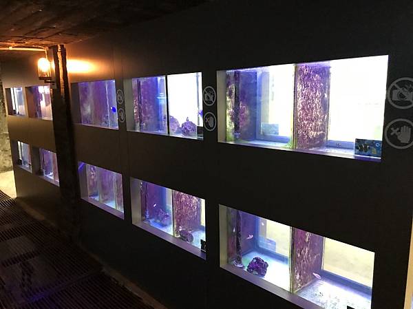 這一整面牆都是水族箱,有許多不同且可愛的魚。