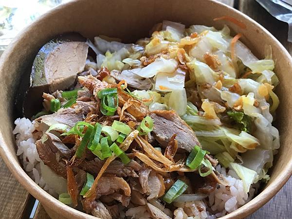 招牌茶鵝金蔥拌飯,沒想到獨家的金蔥鵝油拌飯還真的對味,鵝油入味的米飯好吃到一口接一口,煙燻香的茶鵝肉給的不少,每一塊吃起來口感都非常好,香Q帶勁,而這次搭配當季的鮮蔬是高麗菜也不錯,還有一塊鵝蛋製成的鐵蛋配菜,看到後本來有點後悔另外單獨多買的鵝蛋,沒想到吃起來真的彈牙入味好吃,值得回味。