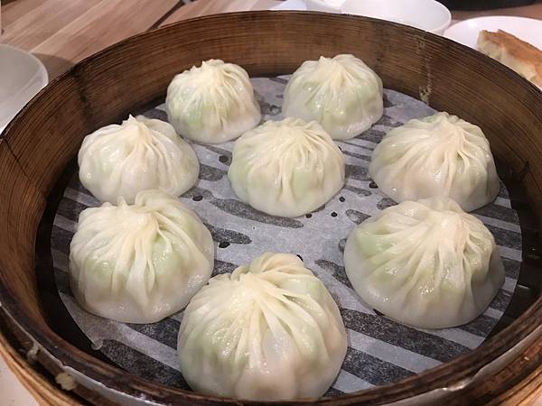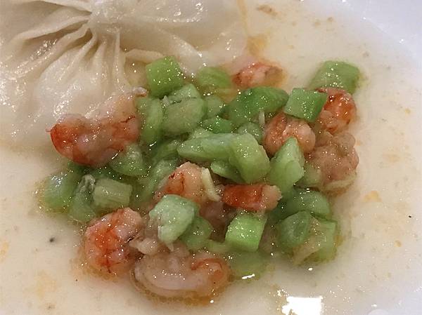 絲瓜蝦仁包,這道號稱是店家的必點菜色之一,光看包子外皮透出的絲瓜鮮綠就知道皮有多薄,包子外觀的摺數至少有10幾摺,應該有維持鼎泰豐的水準。