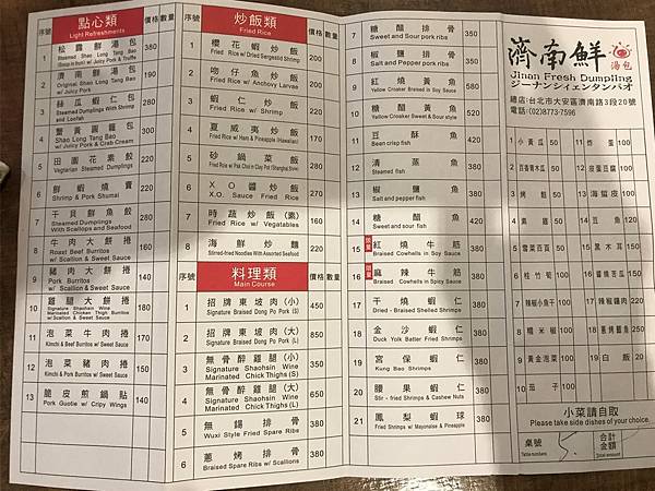 菜單與價目表,濟南鮮湯包的麵食小點非常精緻 (大家都說絲瓜湯包最為出名,所以我們也點了吃看看)。