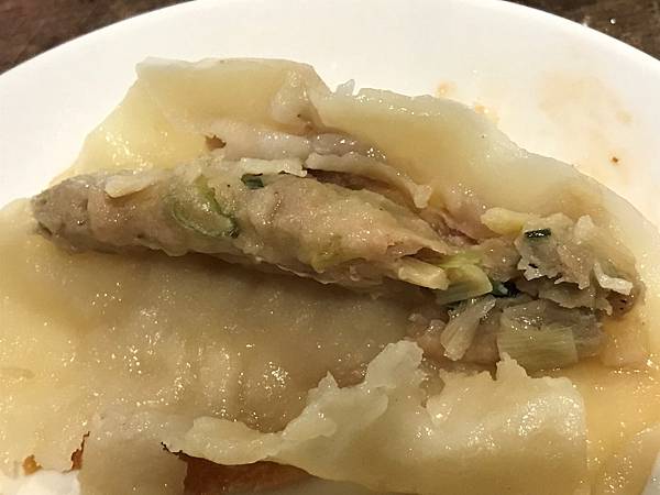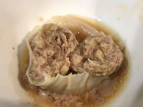 脆皮吃起來有卡茲的聲音,感覺食慾有一點點被挑起,而鍋貼吃起來沒什麼油膩感,打開來看內餡,分辨不太出來有哪些餡料,不過因為鍋貼是先蒸後煎,同時保有脆皮又少油的感覺,所以吃起來感覺不錯。