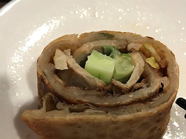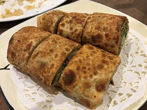 可以看得出厚厚的餅皮,餅皮表面烤成金黃焦糖色,酥脆中帶著Q軟的口感,內餡以整片的豬肉、細長的小黃瓜、蔥配上甜麵醬,配著酥脆的餅皮一起入口,這裡的捲餅有自己獨特的味道,值得一試。