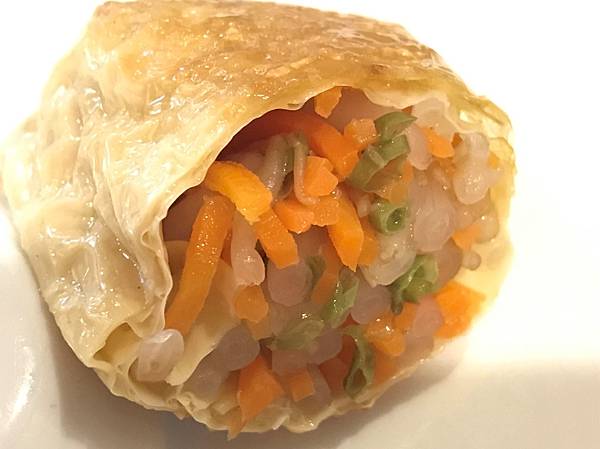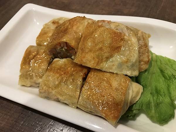 用新鮮腐皮包裹銀芽、紅蘿蔔絲...等餡料,塑型成長方形後入鍋將兩面煎至金黃, 是一道非常著名的港式茶點,吃起來很清爽。
