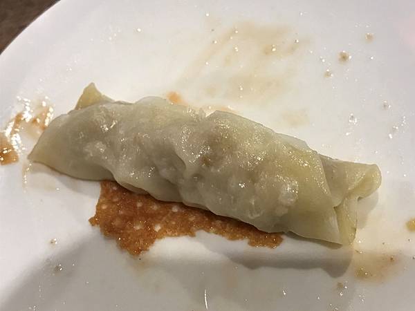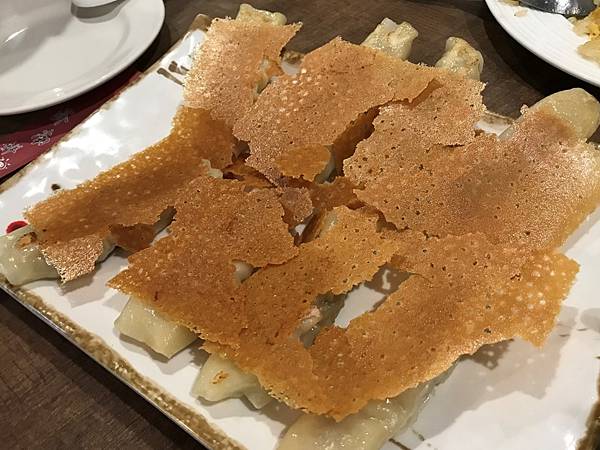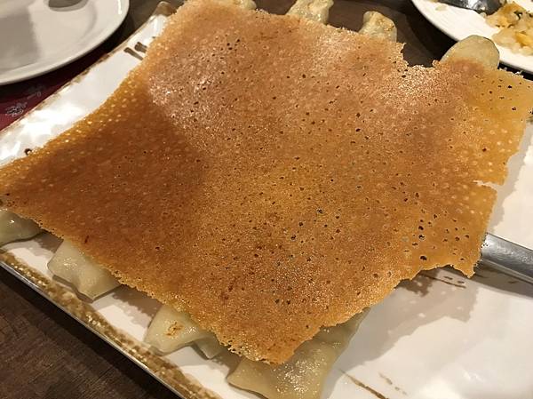 脆皮煎鍋貼,送上來是整面脆皮鏟起來擺放,呈現一大片金黃色,有淡淡焦香。