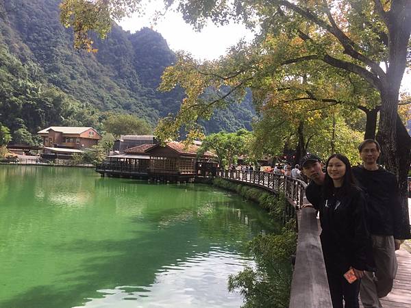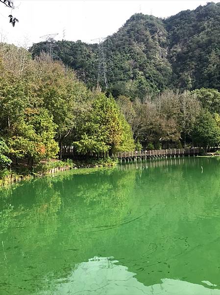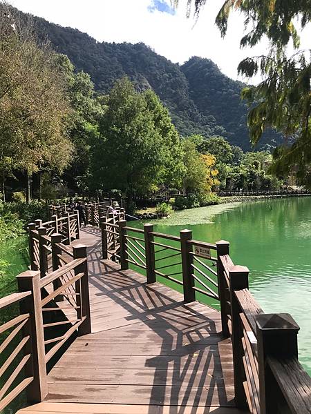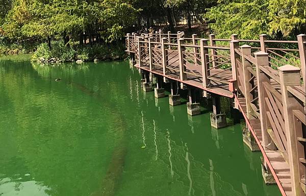 湖底有一條跨越湖面的木棧步道,不知道來源,蠻特殊的,遠處上方還有一隻烏龜在曬太陽。