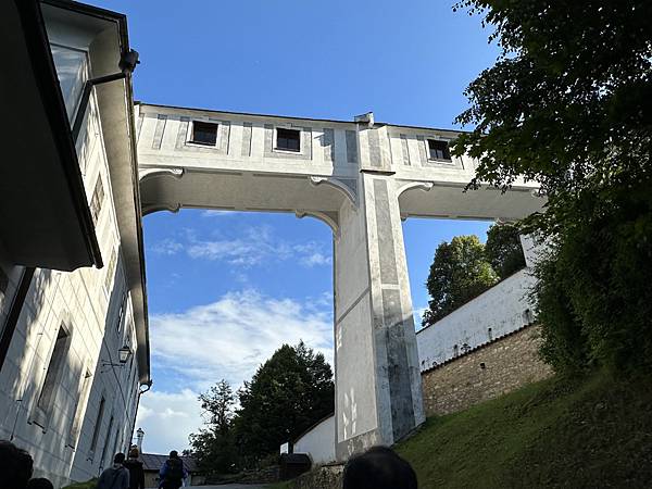 是一座建於十五世紀的空中橋廊,原本是木造吊橋,後來改成石橋,三層樓的石橋以巨大的石柱支撐非常壯觀,曾經被法軍拆毀現在的石橋是後來重建的,橋上有許多聖徒雕像,從橋上也可以眺望小鎮風景。