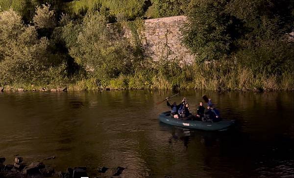 夜晚的休閒不只是喝咖啡,還有人在划橡皮艇,他們都會熱情地向岸邊的人打招呼。