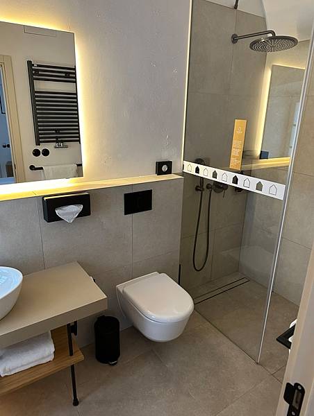 進來中間是洗臉槽和廁所,右邊是淋浴區浴室。