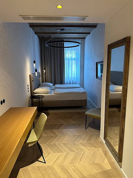 首先看看這間不大的房間,從裡面拍出來,一進來右手邊是一張桌子,接著就是床鋪了。