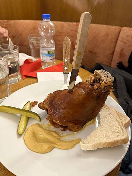 今天晚餐是統一的豬腳餐,擺盤超簡單的,只是刀叉的放法很新奇,這個豬腳的皮比輪胎還硬又韌,刀子幾乎切不斷,只能用叉子挖出裡面的肉來吃,肉倒是好吃