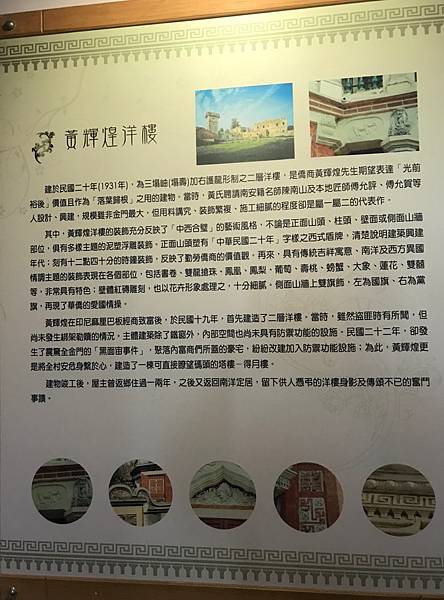 黃輝煌洋樓建於民國20年,是印尼僑商黃輝煌先生期望表達「光前裕後」價值且作為「落葉歸根」之用的建物。其裝飾充分反映了「中西合璧」的藝術風格,雙龍搶珠、鳳凰、時鐘、天使等傳統與西方異國情調的泥塑浮雕,表現在建築的各個部位。