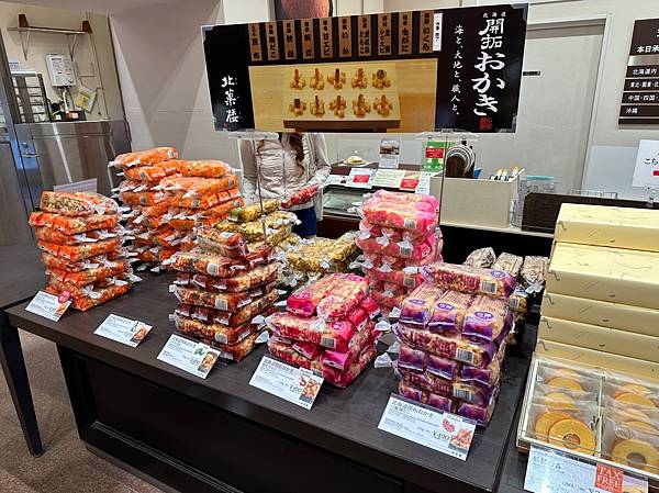 下面這個堆疊如小山的開拓おかき:長條形一包包的可口小米菓,經過蒸、揉、熟成、乾燥、油炸、入味等多道繁複手續製作,口味超多還有限定版,其中秋鮭、昆布、帆立貝、牡丹蝦等五種口味一組的綜合禮盒朋友推薦很適合送禮。