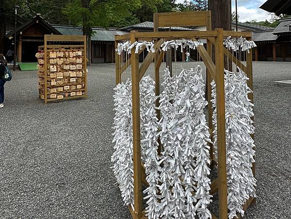 而這個掛滿白紙的是遊客球過的籤詩,許多人抽完神籤後,多數人會選擇將吉籤的好運帶回家;而兇籤綁在神社指定處,期許能逢凶化吉。