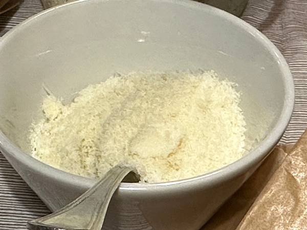 開始上菜啦,首先來的是起士粉。今天是雞胸肉餐,據說雞胸肉在義大利是比雞腿還要高等的。
