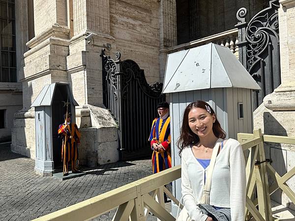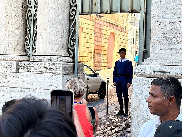 出口處站崗的「梵蒂岡衛隊」是必拍的亮點,不只是因為服裝,而是因為他們的忠誠。領隊說他們是「瑞士僱傭軍」,為現存最古老的軍事組織之一,以紀律和忠誠出名。據說16世紀時神聖羅馬帝國進攻梵諦岡,其他國籍的都離開了,只有100多位瑞士衛兵死守在聖彼得大教堂外保護教皇,後來教皇下令世代都僱用瑞士青年來保衛教皇,所以瑞士僱傭軍是梵諦岡軍隊裡唯一指定的軍隊唷!