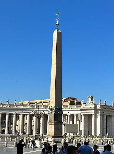 廣場中間最醒目的方尖碑是由羅馬皇帝卡利戈拉(Gaius Caligula)從埃及帶回,放在尼祿皇帝設置的競技場中,當做馬車競賽時的折返點,後來部分競技場改為聖彼得大教堂後,也將方尖碑移至聖彼得廣場中心位置,做為聖彼得殉教的見證。