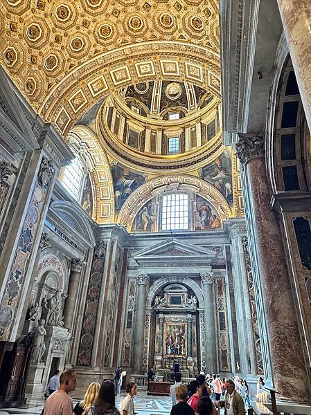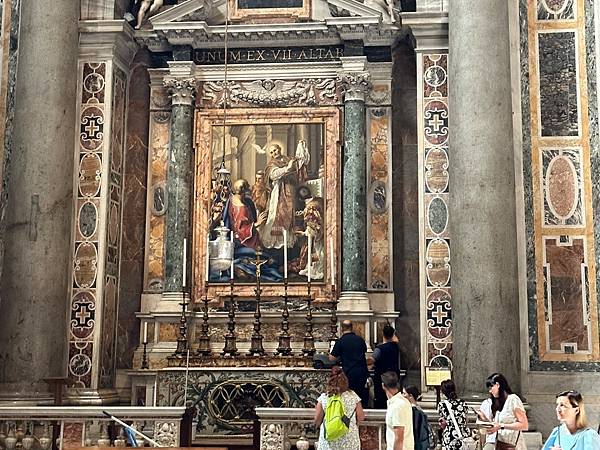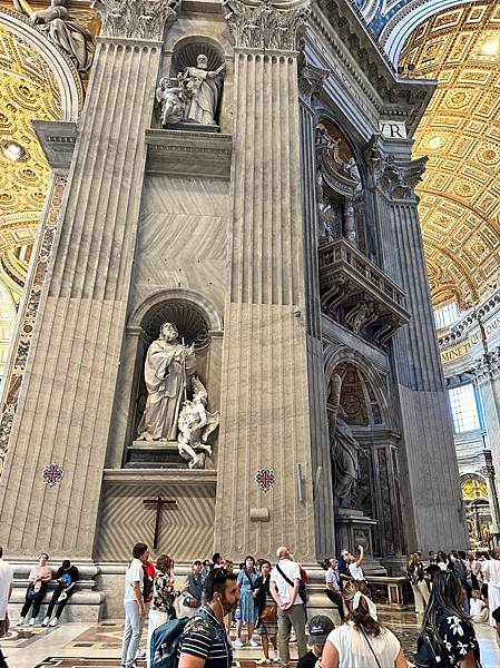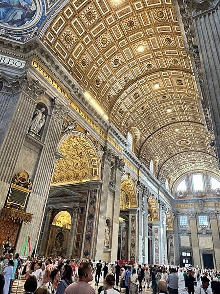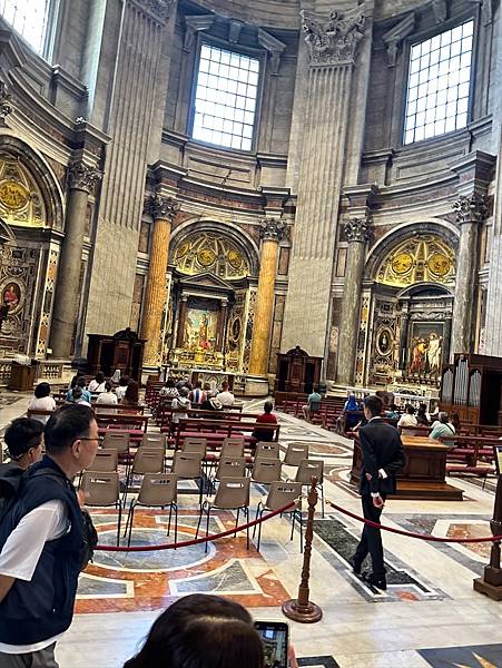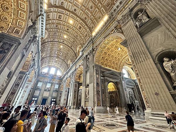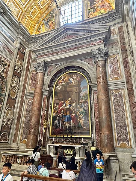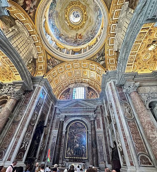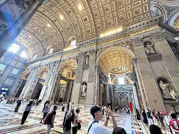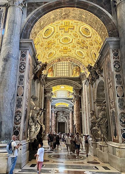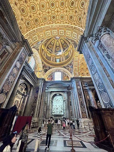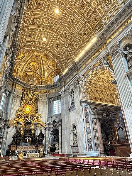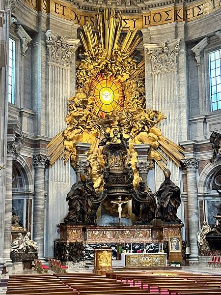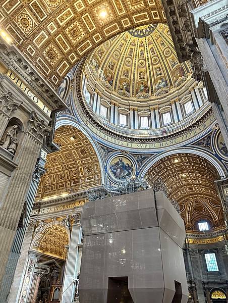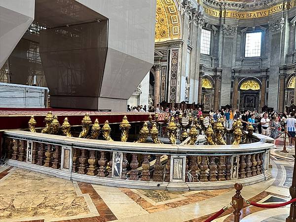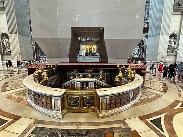值得一看的是正中央的巴洛克風格聖體傘(baldacchino),因施工中,只能從縫隙中看看,這是建於1624年,覆蓋在聖彼得墳墓正上方,高達20公尺、重達3.7萬公斤的聖體傘,是全世界最大的銅鑄物。