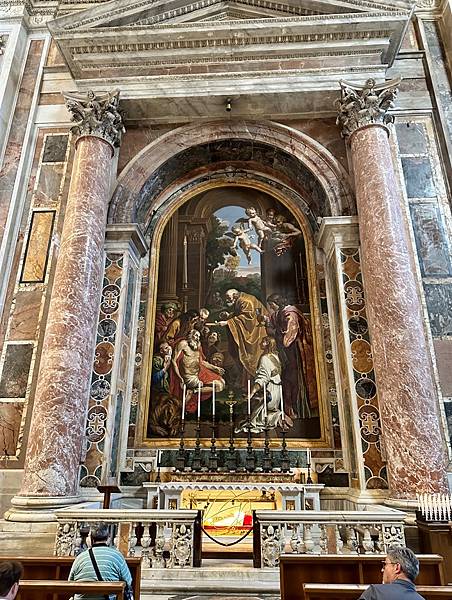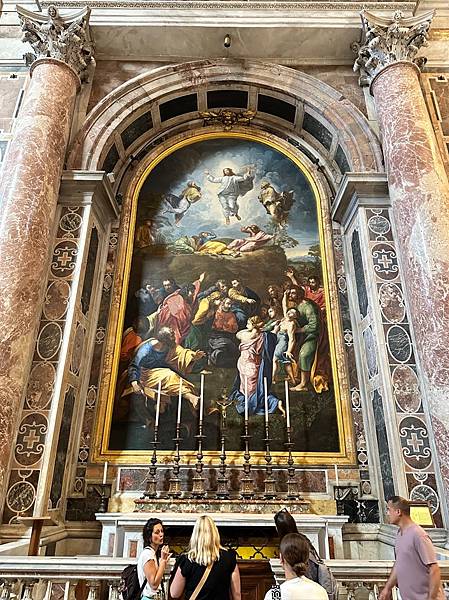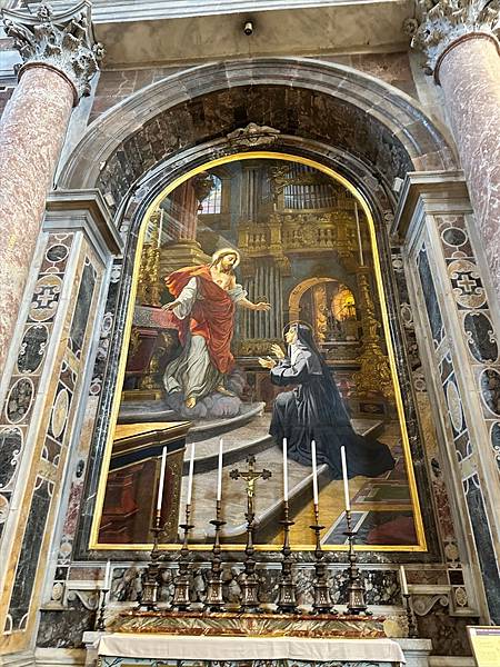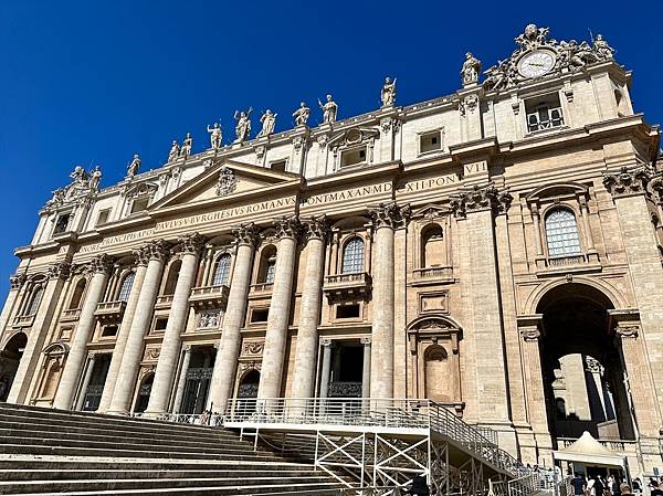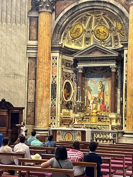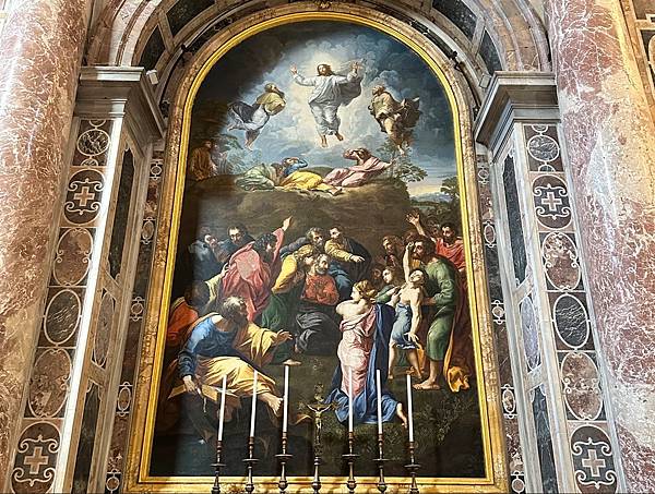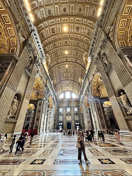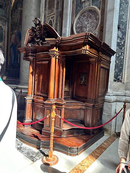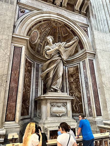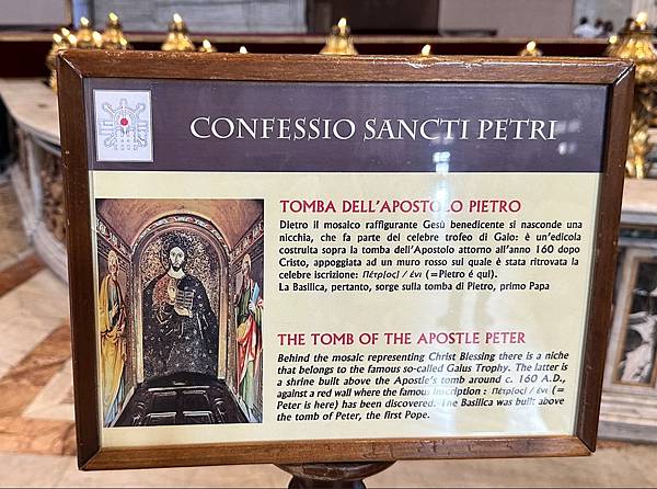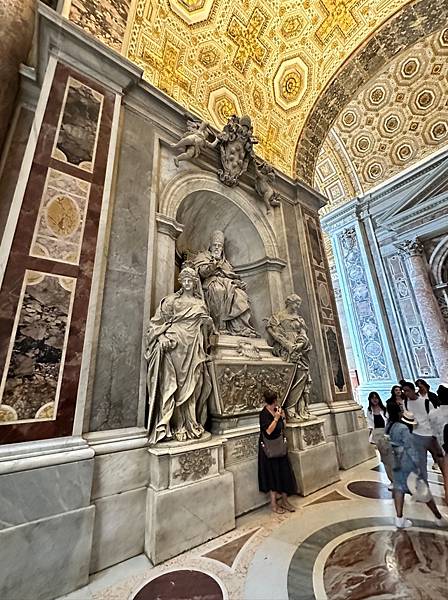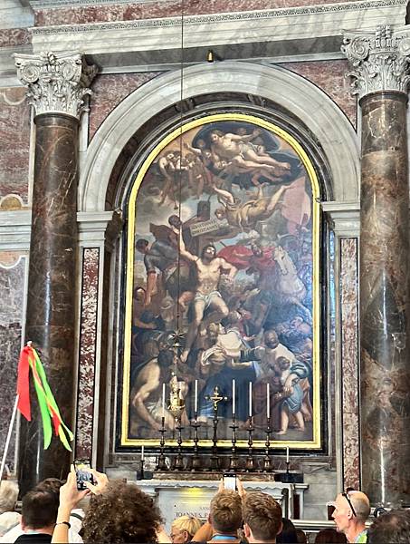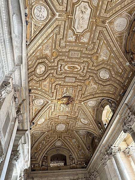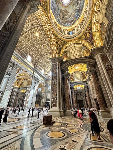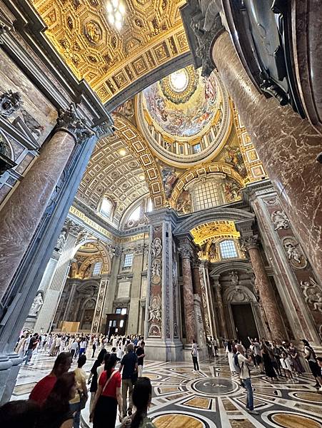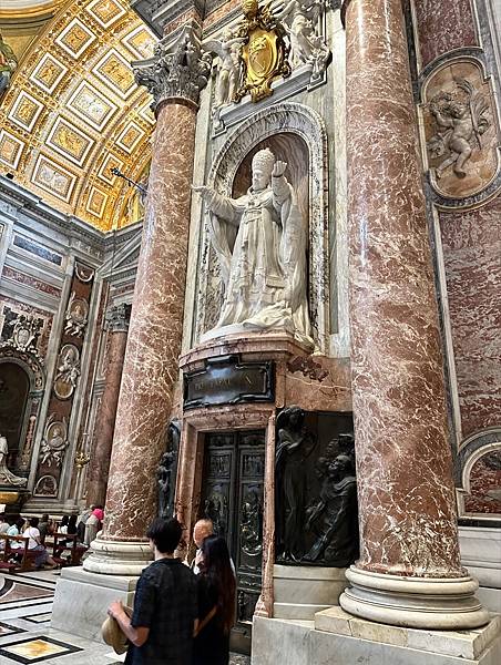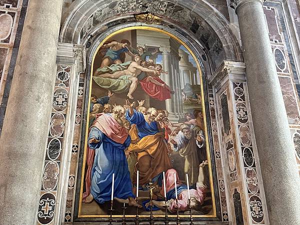 值得一看的是正中央的巴洛克風格聖體傘(baldacchino),因施工中,只能從縫隙中看看,這是建於1624年,覆蓋在聖彼得墳墓正上方,高達20公尺、重達3.7萬公斤的聖體傘,是全世界最大的銅鑄物。
