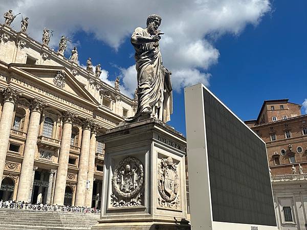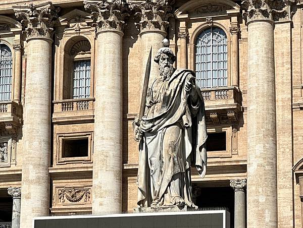 聖彼得大教堂前的2尊雕像。右邊的這尊是聖保羅,由於聖保羅市被劊子手用長劍斬首,因此雕像的右手拿著長劍,左手拿著經文代表他四處宣傳教義。