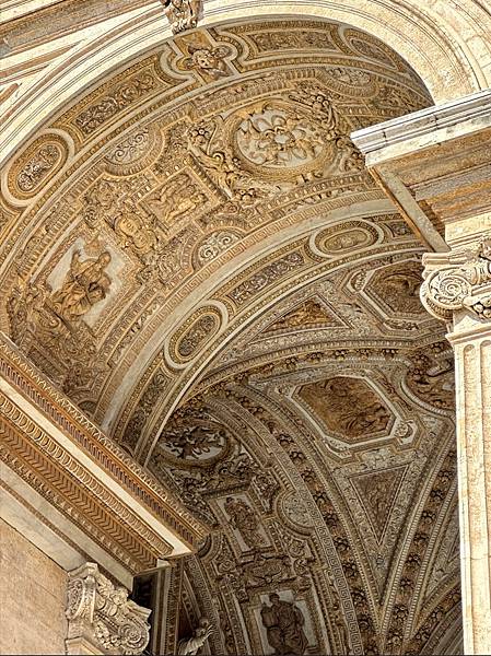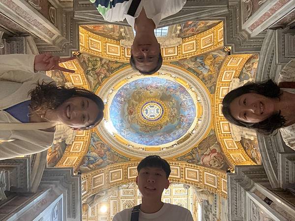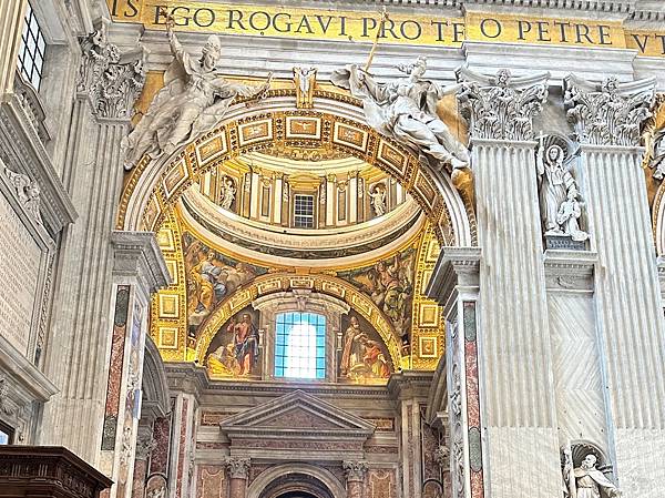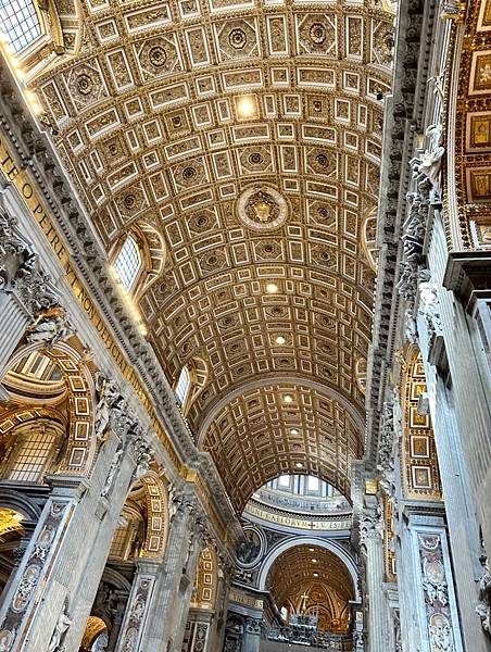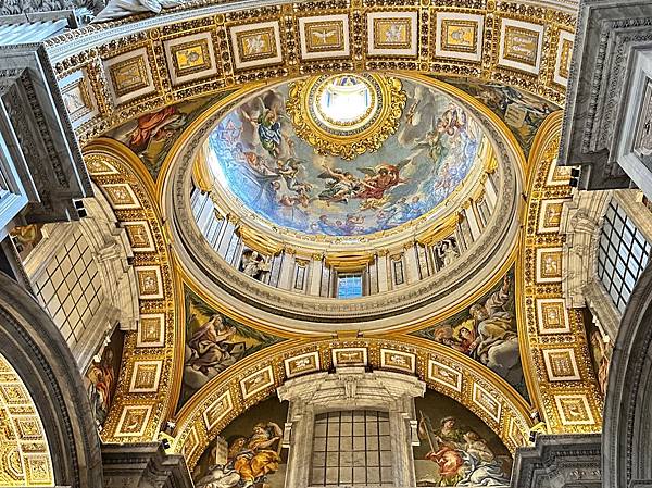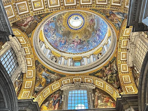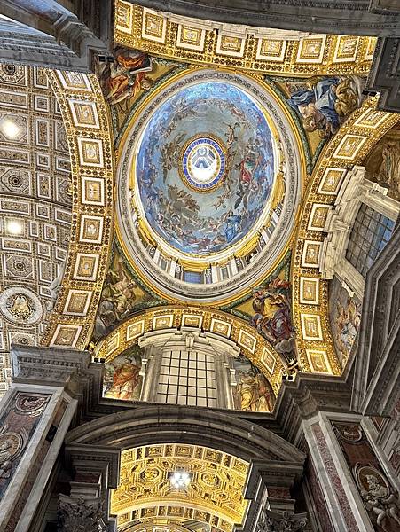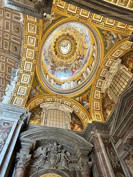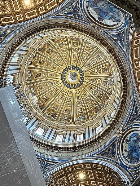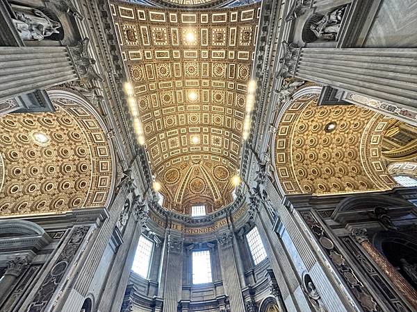 記得從聖體傘旁邊仰望由米開朗基羅設計的大圓頂(穹頂),這就是個藝術品,米開朗基羅被教皇任命成為聖彼得大教堂的總設計師時,為了汲取設計大穹頂的經驗,他觀摩了佛羅倫斯百花大教堂穹頂設計,策劃內外兩層穹頂,內部穹頂以16根肋拱強化支撐,米開朗基羅將他人生中最後幾年貢獻給這大穹頂,直到他過世時,大穹頂只有一部分完成,由後來的建築師接手完成。