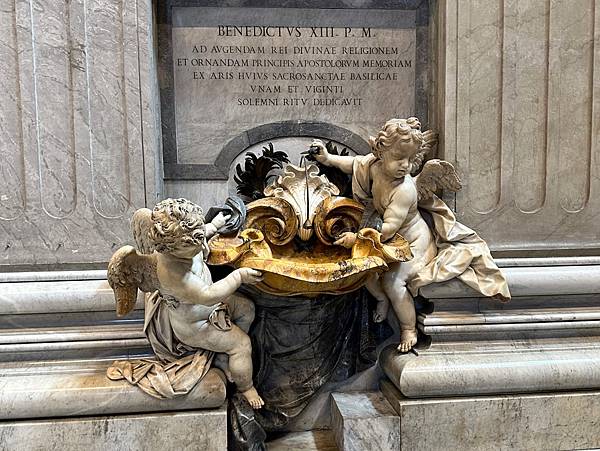 這個可愛的天使是<聖水缽>,高2.5公尺,裡頭裝有被祝福過的聖水,教徒可沾取在胸口畫十字以獲得祝福,但因為遊客有樣學樣以至於聖水不足,現在改為慢慢地滴水。