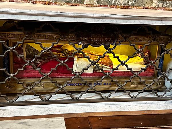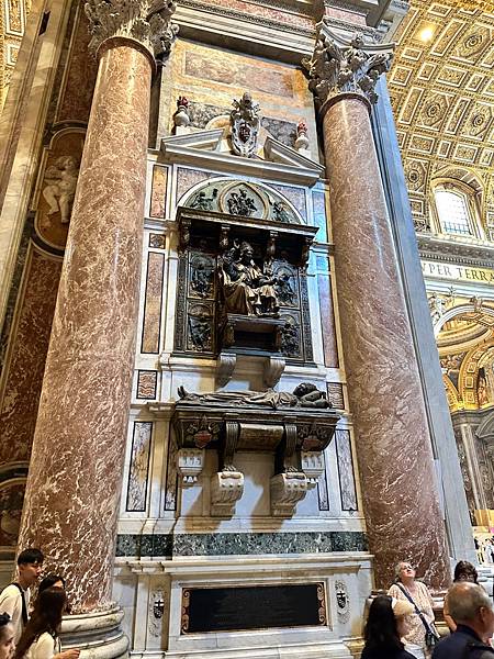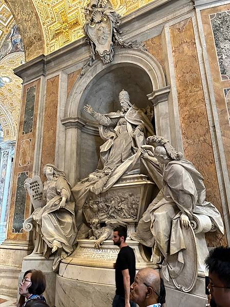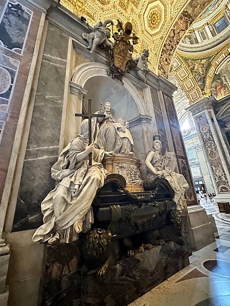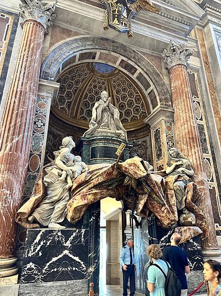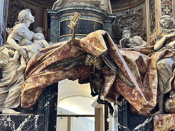 這是貝爾里尼親自為庇護他的教宗Alexander VII設計的紀念碑,教宗腳下的祭毯用紅白相間的大理石雕刻而成,幾可亂真。