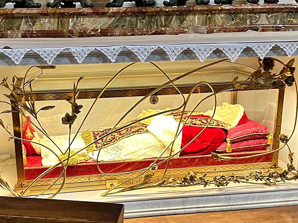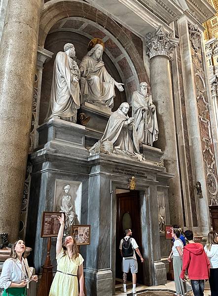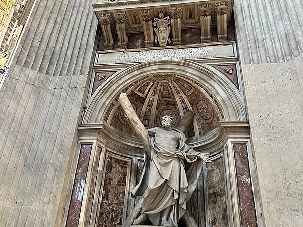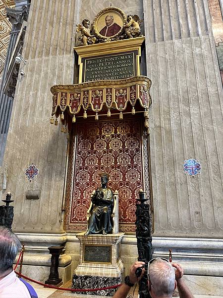 這是聖彼得雕像,信徒會觸摸或親吻聖彼得腳,讓聖彼得雕像右腳日益受損,所以現在已經圍起來了。