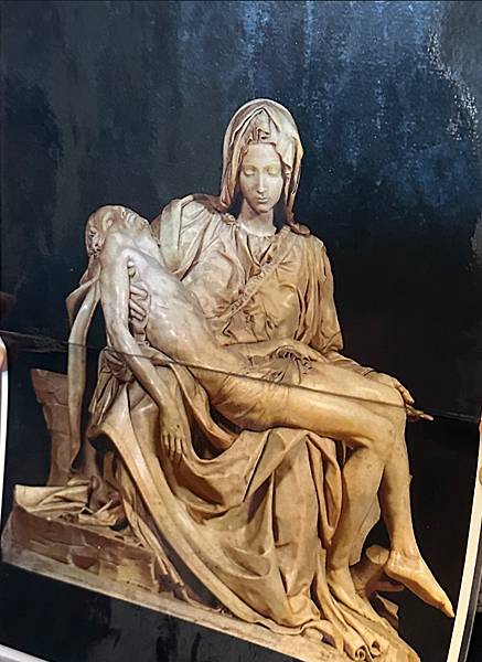 面對聖體傘、主聖壇,右手邊第一件藝術品就是最有名的米開朗基羅作品 ─ 聖殤(Pietà),在義大利文中有「悲憫、虔誠」之意, 於1498–1499年製作,大小為174 cm × 195 cm。題材來自於聖經,聖母瑪利亞抱著被釘死的耶穌身體時的樣貌,悲傷不是這作品的重點,而是聖母表情很鎮定、堅強。作品完成之際,一度曾傳出「聖殤」是義大利北部另一位藝術家作品,當時25歲的米開朗基羅為了正名,就在聖母胸前衣帶刻上自己名字,這件作品讓米開朗基羅一戰成名,往後的作品都不需要署名,大家都知道是他的作品了。