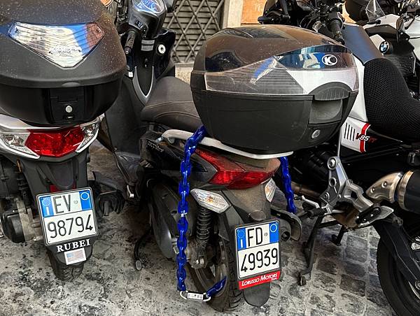 最後分享一下特殊的景,義大利有摩托車不稀奇,稀奇的是居然用這麼大的鐵鍊鎖車,而且不同區域都有,蠻特殊的。