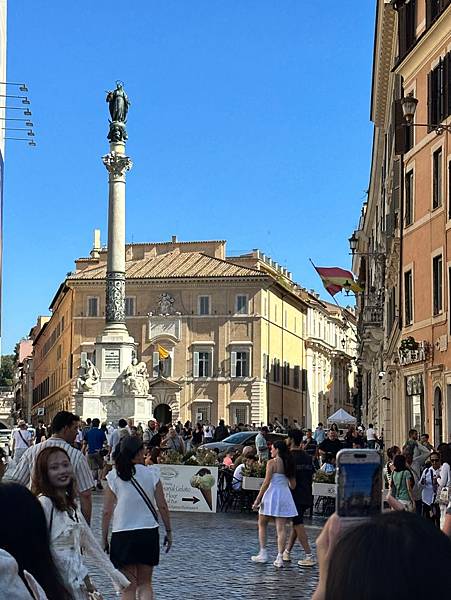 離開許願池特雷維噴泉往西班牙階梯前進,遠遠路上會看到一個醒目的柱子,這是聖母處女受孕紀念碑,每年12/8日教宗會親自到此,由一位消防隊員爬到柱頂端,獻花給聖母,就是她右手那個花環,足足掛一年喔。